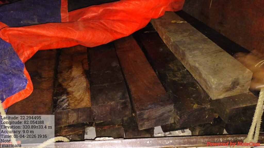 जांच करने पर अधिकारियों के होश उड़ गए; वाहन के भीतर बेशकीमती साल प्रजाति की 27 नग लकड़ी (चिरान/चौखट) छिपाई गई थी, जिसका कोई वैध दस्तावेज चालक के पास नहीं था।